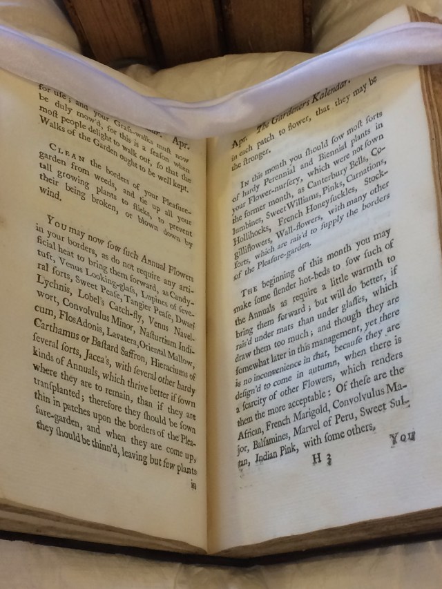 There was also a copy of Miller’s other best-selling work, the Gardener’s Kalendar, one of those useful but terrifying month-by-month instruction books which remind you how far behind you are with your garden chores. This is the sixth edition of 1743; there were fifteen between 1731 and 1769.