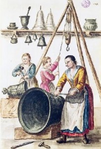 The Grevembroch picture shows other artifacts of metal in the shop, and this is borne out by probate inventories, which list mortars, firedogs, and household ware of iron, copper and pewter. Such lists also include large bells, which suggests that some were cast on spec, but the vast majority must have been made to order. Avery cites written orders, which go into a lot of detail about the cost of materials, how much is to be reused from older damaged bells, the total weight (and the non-recoverable cost of metal inevitably lost in the casting process, calculated as a percentage), completion date, and guarantee. Some times the contracts also included costs for transport and re-hanging. Verbal contracts were also used, but these are mostly known because of the legal disputes to which they sometimes gave rise…