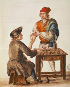 The tattooist with a customer. The items on his bench are presumably the designs from which you could choose.