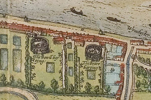 The bull- and bear-baiting arenas on the south bank of the Thames, before the arrival of the playhouses (c. 1560).