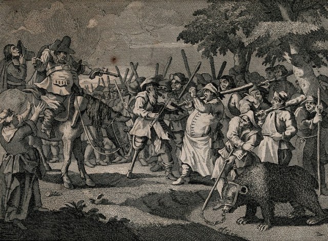 Hogarth‘s 1725 illustration for an episode from Samuel Butler’s mock-epic poem Hudibras: a bearward is among the rabble driven away by our hero.