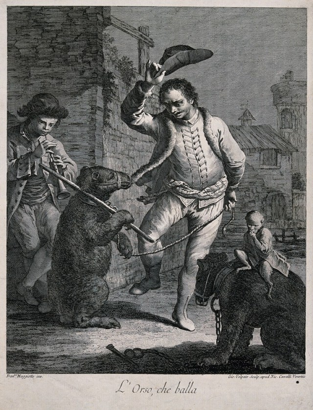 A pair of dancing bears with their keeper; one has a monkey on its back. (Engraving by Giovanni Volpato after Francesco Maggiotto (1738–1805))
