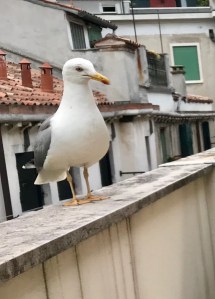 I noticed with interest that although the feeding of the poor, ratty-looking birds in St Mark’s Square is still strictly prohibited, some vendors appeared to be slipping grain to family parties anxious to take a classic Venice photo. And although I was aware that large numbers of the permanent inhabitants of Venice own dogs, I wasn’t really conscious of how many there are until we had to stop and make approving noises at every one we passed. And on the wildlife front, a highlight of the stay was the unexpected arrival of Bruce the seagull on our balcony.