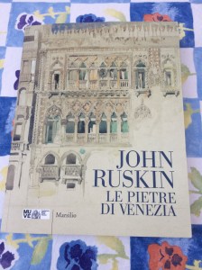 Another interesting acoustic was provided by the (now just finished) exhibition at the Palazzo Ducale: ‘John Ruskin: Le Pietre di Venezia‘. We had taken the precaution of booking tickets in advance, but in fact had the place virtually to ourselves, so were not too concerned as she pottered back and forth over the smooth terrazzo in bare feet (nothing on display was at a reachable/dangerous level), testing the echo, until one of the front-of-house people kindly warned us that she ought to have shoes on because the floor surface was crumbling in places and the fragments were often sharp…