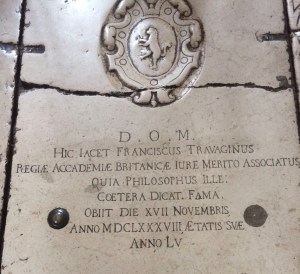 The 1688 gravestone of Francisco Travagini, corresponding member of the Royal Society of Great Britain, in the Frari.