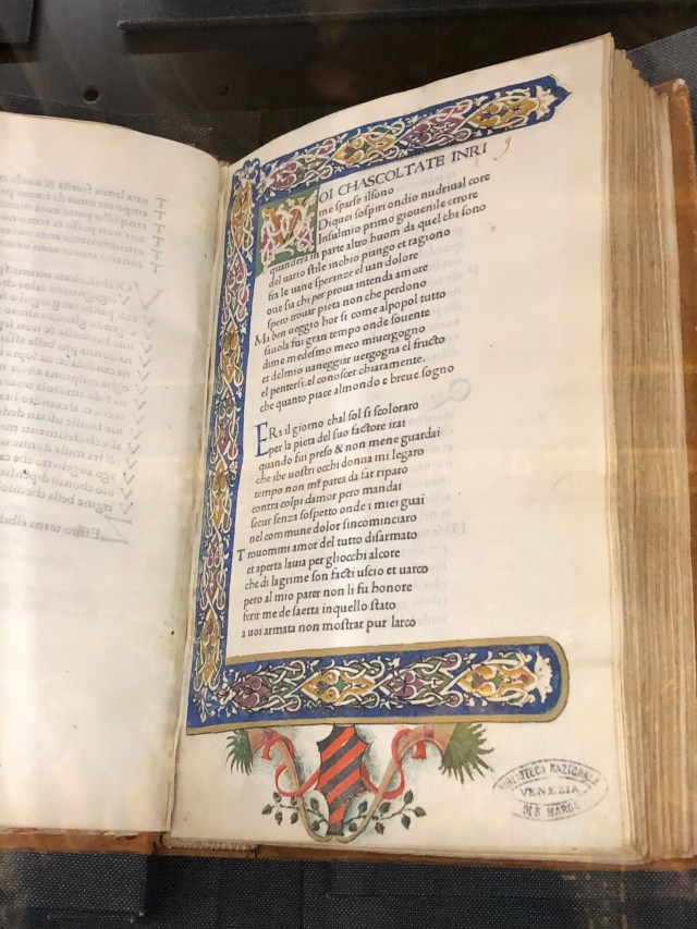 The subtitle of ‘Printing R-Evolution 1450–1500’ is ‘I cinquant’anni che hanno cambiato l’Europa’, and the curators make an excellent case for this claim. There are books on display, from a leaf of the Gutenberg Bible onwards (as well as number of manuscripts), but the focus of the exhibition is on the research project based in the University of Oxford, the British Library and Venice itself, ‘15CBOOKTRADE’, and an important part of what is on show is statistics – what books were printed where, where decorated, how decorated, where bound, where how many sold, where sold, at what cost, and so on. (The project is funded by the ERC, so goodbye to all that (and much more) next year if the current British insanity prevails.)