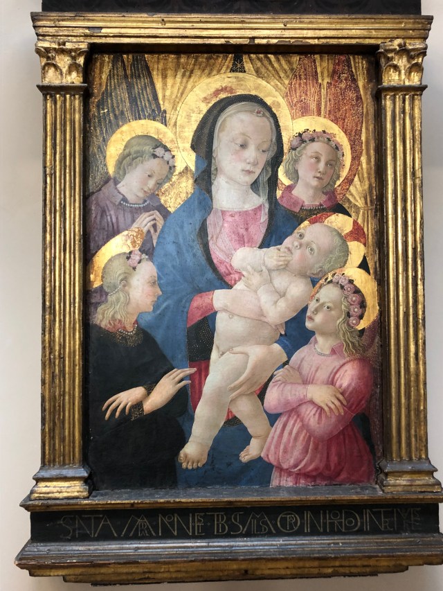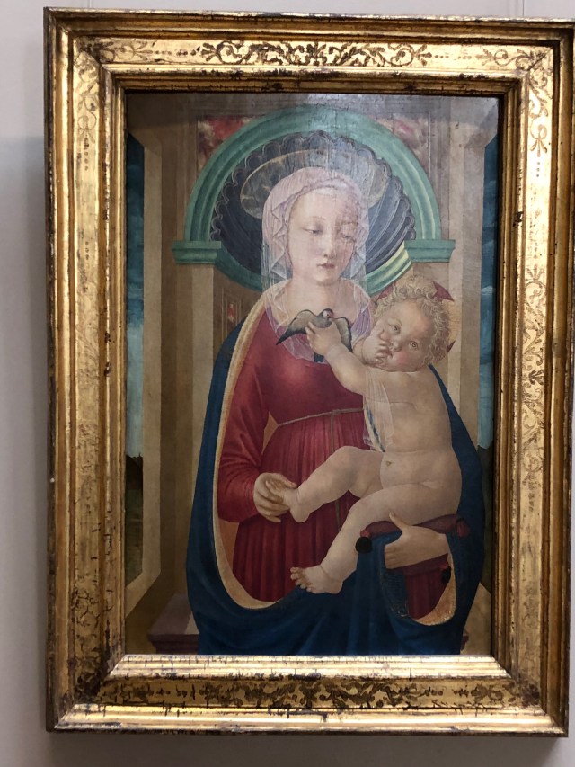 By the same painter, ‘Virgin and Child with a Goldfinch’ (c. 1455–60). A goldfinch quite often appears in this scene: one theory is that the bird is a protector from the plague; another, that it is a symbol of innocent childhood.
