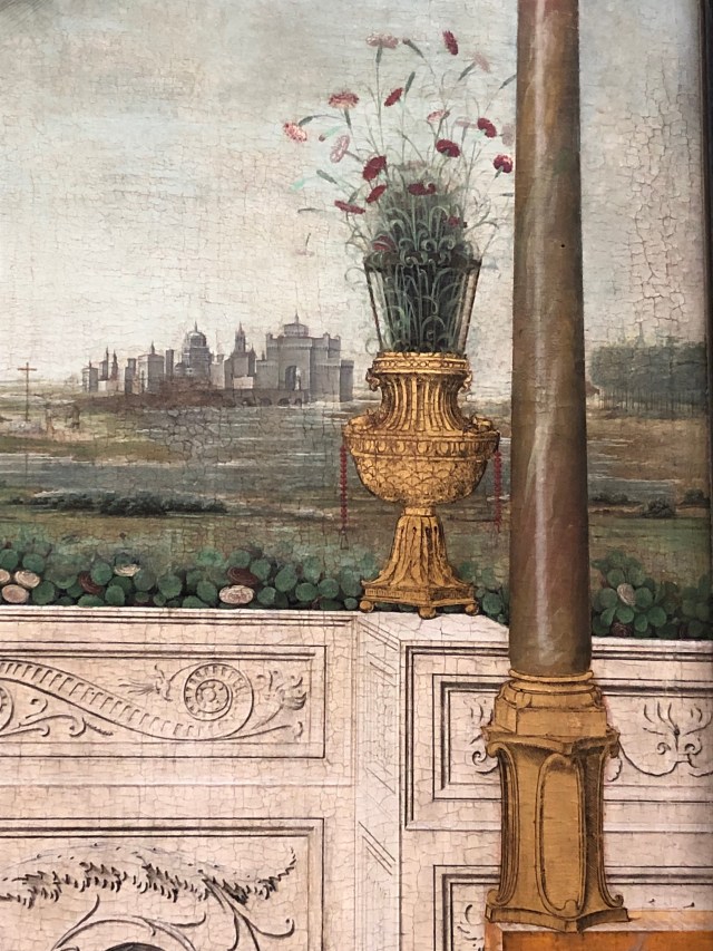 A vase of pinks, detail from ‘The Annunciation’, the central panel of a triptych by Carlo Braccesco (c. 1490–1500), acquired by Vivant Denon for the Louvre in 1812 from an unidentified oratory in Genoa. The city in the background is reminiscent of Mantua (?).