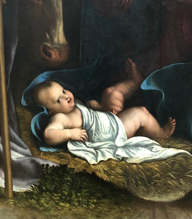 This Bambino is presumably laughing at the absurdity of his own legs. Giulio Romano, ‘The Adoration of the Shepherds, with St Longinus and St John the Evangelist’ (1532–4), from the collection of Louis XIV, acquired in 1662.