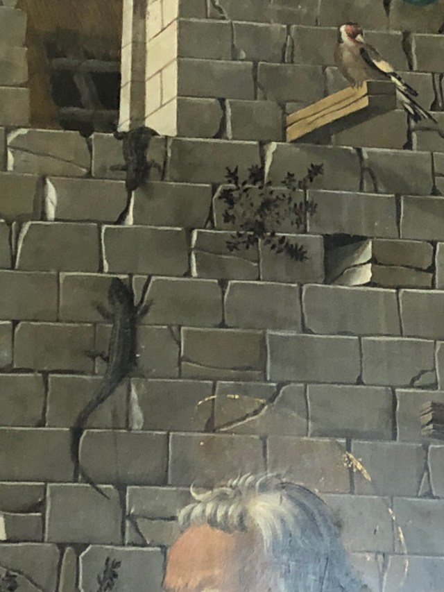 A detail from the ‘Nativity’ (c. 1465–70), by Fra Diamante. On the back wall of the stable, two lizards confront each other, while a goldfinch peers down over St Joseph’s shoulder. From the church of Sta Margherita at Prato; entered the Louvre in 1812.