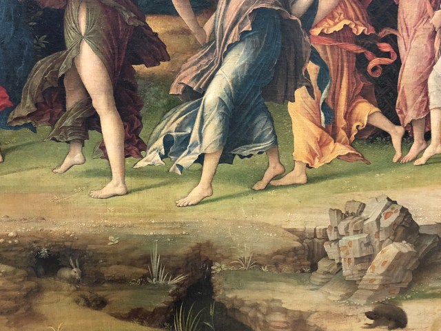 Detail from ‘Parnassus’, by Andrea Mantegna, one of a series painted in 1497 for the studiolo of Isabella d’Este in Mantua; entered the Louvre in 1801. The dancing Muses tread the sward above a rabbit and a black squirrel.
