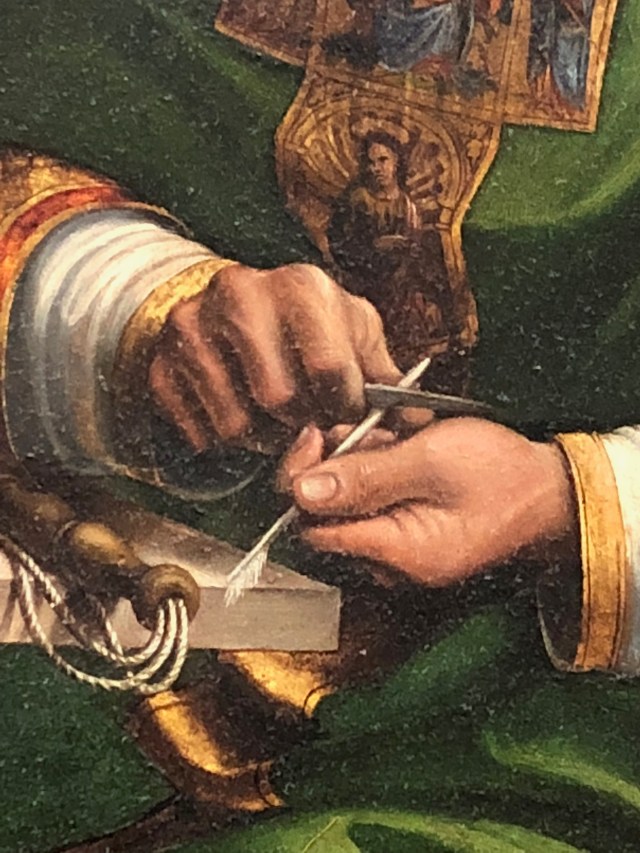 St Ambrose (at whose feet sits a spectacular #notalion) sharpens a quill, from ‘The Four Doctors of the Church’, by Pier Francesco Sacchi (1516), from the church of San Giovanni Evangelista di Pre in Genoa; entered the Louvre in 1813.