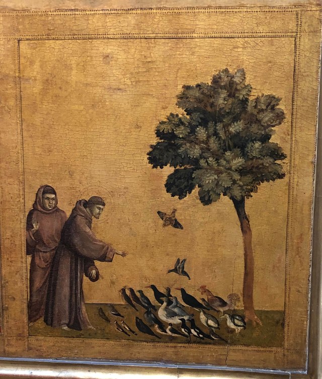 St Francis preaching to the birds, by Giotto, from the predella of ‘St Francis Receiving the Stigmata’ formerly in the church of San Francesco in Pisa; entered the Louvre (along with several other paintings from the same church) in 1813.