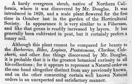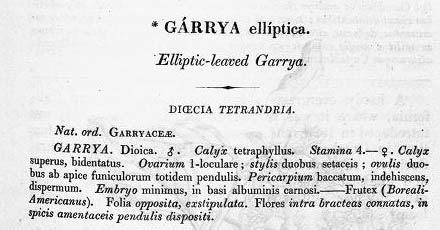 The taxonomic definition was published by John Lindley in Edwards’s Botanical Register in 1835 (extracts above), with an explanation of why the name of Nicholas Garry should be commemorated – this was of course after Douglas’s tragic death (or was it murder?).
