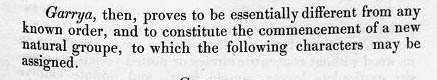 The taxonomic hierarchy is: Asterids > Garryales > Garryaceae > Garrya. The Garryaceae include garryas and also aucubas, which on the face of it have very little in common with each other, especially as the latter come from the Far East, with a spread from the Himalayas to China, Korea and Japan: the genus was named by Thunberg, apparently from the Japanese name, Aoikiba.