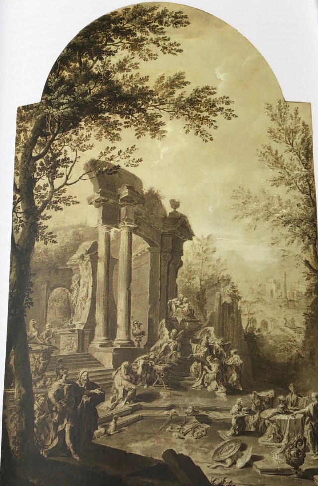 G.B. Pittoni and others, ‘An Allegorical Monument to Sir Isaac Newton’ (PD.52-1973). (Credit: Fitzwilliam Museum) Many of the paintings involved two or even three artists, doing the landscape, figures and architecture respectively.