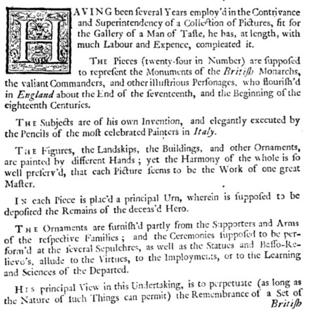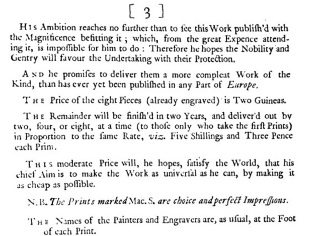 The duke of Richmond apparently acquired at least ten of the paintings (though I can’t find out whether they are still at Goodwood), but Swiny’s cunning plan was to issue all twenty-four as a bound collection of prints, to which end he issued a prospectus (probably about 1730) addressed ‘To the Ladies and Gentlemen of Taste in Great-Britain and Ireland’, in which he explains the origin of the paintings (though interestingly he doesn’t give the individual names of any of the artists) and appeals for subscriptions to buy a set of the engravings.
