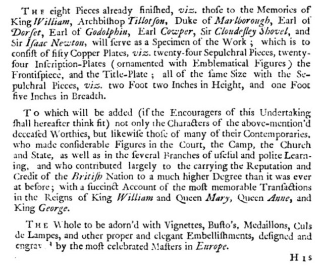 It doesn’t appear that this volume ever happened – presumably there were not enough ladies and gentleman of taste around. He did finally succeed in producing a set of prints, by French engravers, in 1741: Tombeaux des princes et des grands capitaines et autres hommes illustres qui ont fleuri dans la Grande Bretagne vers la fin du XVIIe et le commencement du XVIIIe.