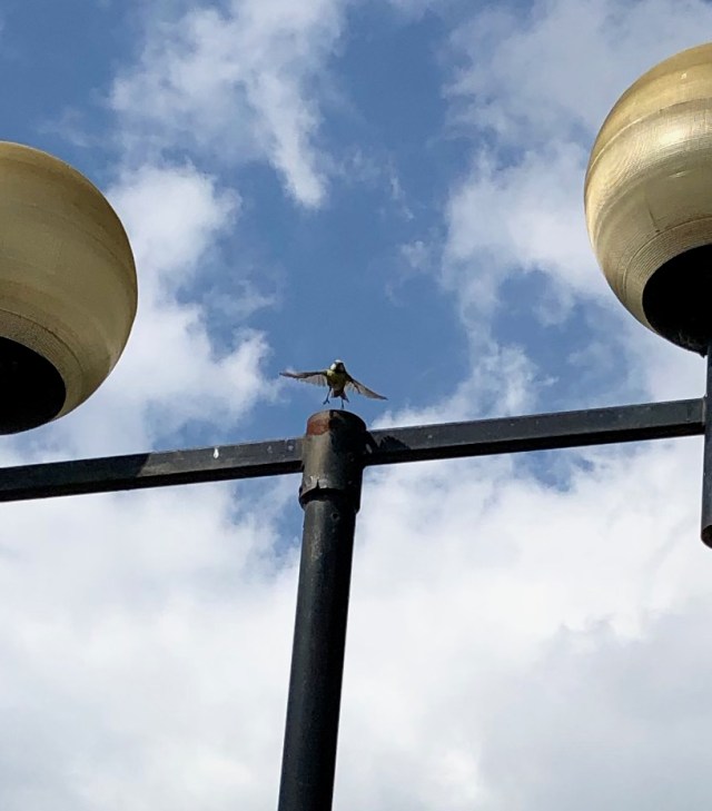 I spotted another nest, on a smaller scale, inside the central post of this street light: the parent bluetits were in and out so rapidly that I was astonished I actually caught one on camera.