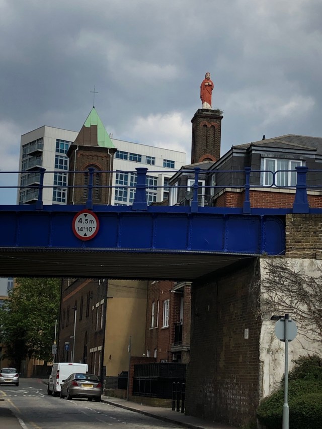 The church of St Mary Immaculate and St Frederick, Limehouse, with the statue.
