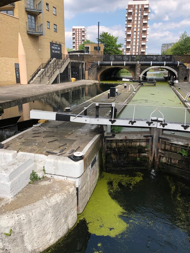 Before the railways, of course, were the canals. The Regent’s Canal, which linked the east London docks with the Grand Junction Canal, was developed from the 1790s: the last section, from Camden to Limehouse (and including a 969 yard tunnel under Islington) was opened on 1 August 1820. Duckweed is now spreading remorselessly from the lock to the basin …