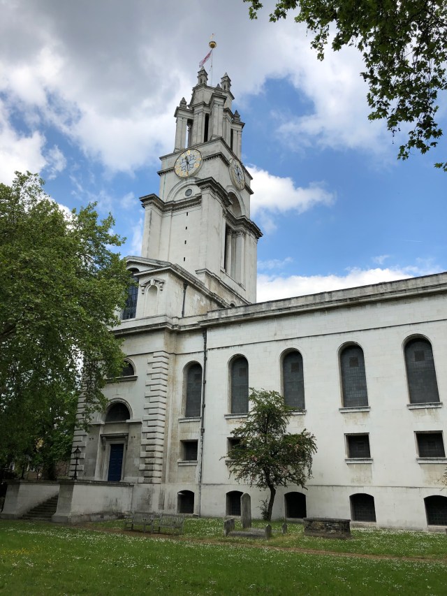 I decided to walk up to St Anne’s, Limehouse, a Hawksmoor church, like St George’s in the East, built as the huge parish of St Dunstan’s, Stepney, was split into smaller chunks to care for the souls of the burgeoning population of London. They are sometimes called ‘Queen Anne Churches’ as she took an interest; they were funded by a tax on coal being moved down the river Thames (originally imposed in 1670 to pay for the rebuilding of St Paul’s). There were intended to be fifty: only twelve were built, though seven existing churches were also restored.