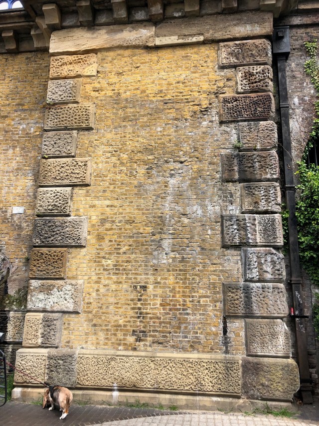 Walking past Limehouse Basin to the end of the Regent’s Canal, I stopped to read an information board, which revealed something so blindingly obvious that I had never thought of it before. The Docklands Light Railway, in the stretch from Shadwell to past Limehouse, runs on very old arches. What these turn out to be are the structural remains of the 1840 London and Blackwall Railway, built by Robert Stephenson and G.P. Bidder to link the City with the Blackwall river ferry.