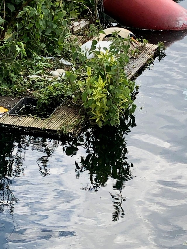 A swan is nesting at the edge of the basin, and as we passed she (he?) was busy tidying her surroundings – the picture is not brilliant as she was on the move the whole time, picking up twigs in her beak and twisting her neck to throw them to one side. There are at least three eggs in the nest, so I hope she finished her spring-cleaning quickly and is now back on top of them.