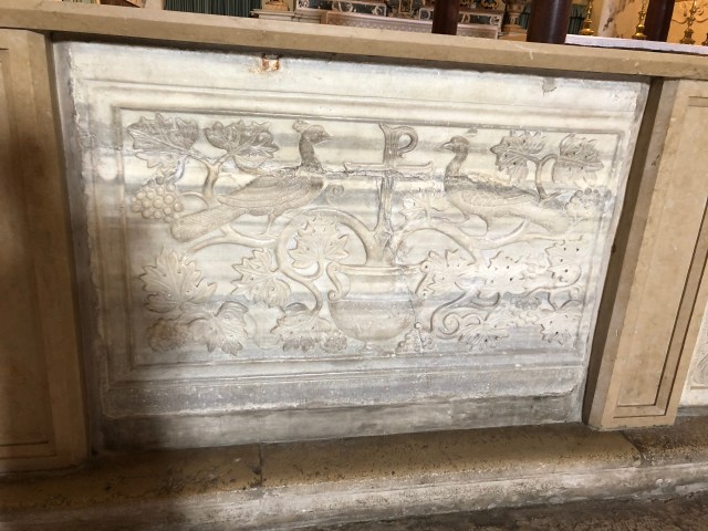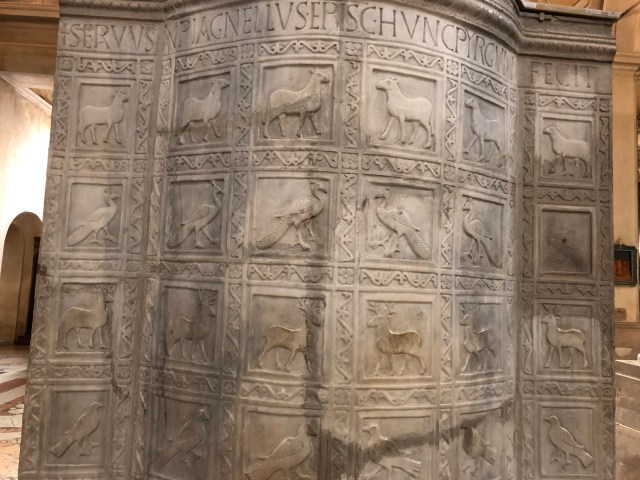 The enormous pulpit in the Duomo at Ravenna is decorated with tiers of birds and animals, including peacocks (below).
