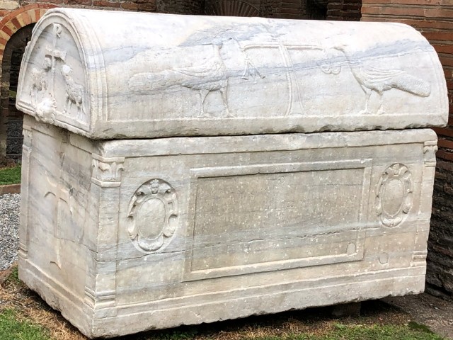 Outside San Vitale, a sarcophagus with peacocks and lambs on the lid.