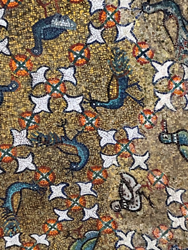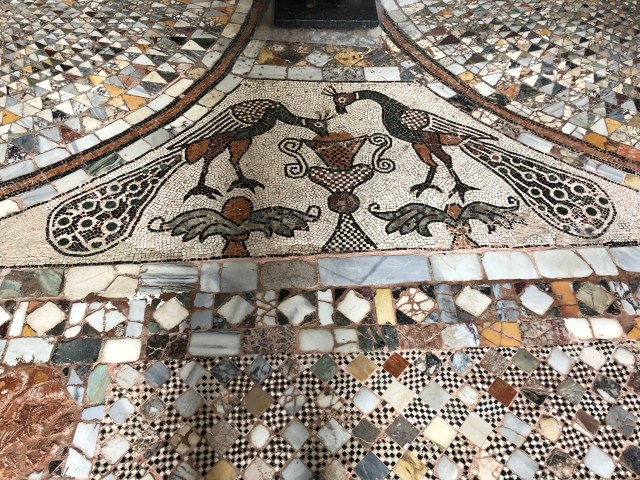 In addition, the eyes in the peacock’s tail (plucked, according to Greek legend, from the head of the hundred-eyed giant Argus and placed there by Hera when he messed up a straightforward surveillance job) represent the all-seeing eye of God. And when a peacock sips water from a fountain, the image is that of the soul drinking the water of eternal life. So here are some peacocks from Venice and Ravenna.