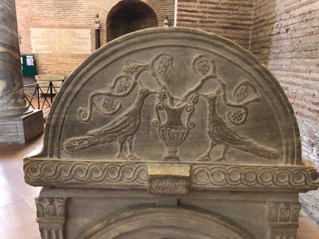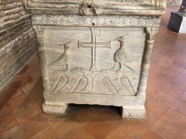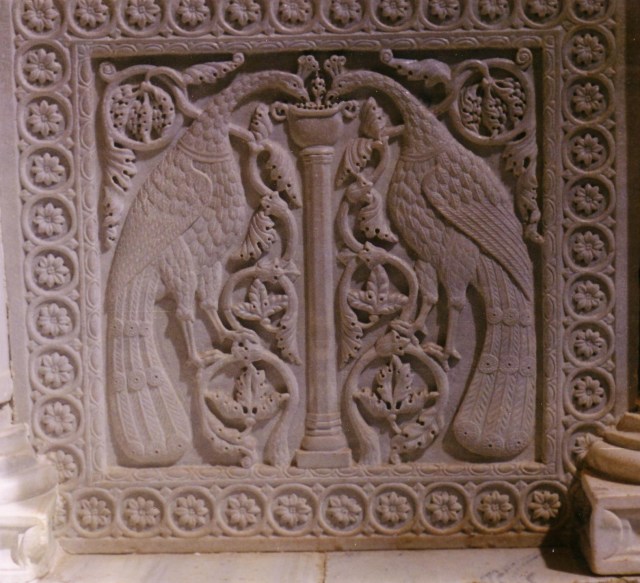 A sarcophagus from the church of Sant’ Apollinare in Classe, Ravenna, showing peacocks and vines with the Christian symbols of the Chi-Ro and Alpha and Omega.