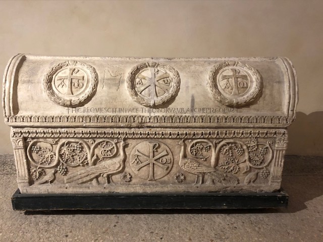 Inside the remarkable National Museum at Ravenna, a sarcophagus, with similar imagery to the one at Sant’ Apollinare in Classe, but even more finely carved.