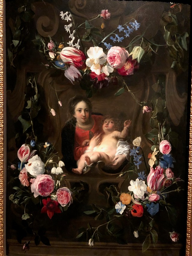 Flower paintings were well represented: here are two, the first by Daniel Seghers (1590–1661) and the second by Seghers (the flowers) and Cornelis I Schut (1597–1655) (the rather cloying Madonna and Bambino).