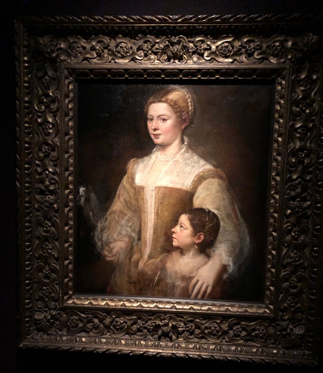 The absolute and undisputed (also by me!) masterpiece in the show is a portrait by Titian of ‘A Woman and her Daughter’, which after the artist’s death was extraordinarily transmogrified by someone in his studio into a picture of Tobias and the Angel (the wonderful exhibition catalogue shows ‘before and after’ shots of the transformation). The woman and girl are thought to be Titian’s mistress (possibly a servant in his household) Milia and their daughter Emilia Vecellio (who was born between 1543 and 1548).