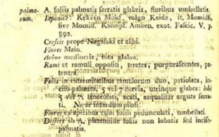 The section from Thunberg’s Flora japonica (1784) which describes Acer palmatum among six types of Japanese acers.