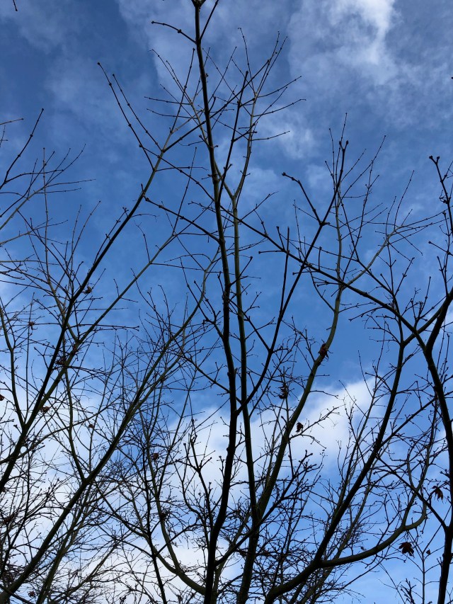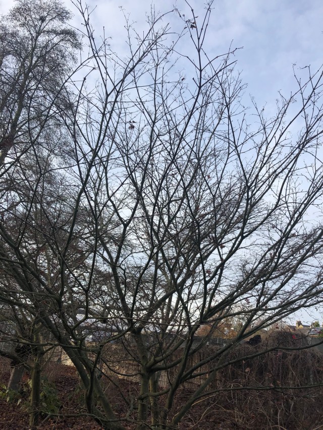 It is quite large for a Japanese maple, and can reach up to 4 metres of height and spread, so that if it is suitably pruned you can walk under it and look through the canopy – though I have seen many grown as multi-stems, and apparently they do well in containers. So here is a sequence of pictures, beginning in a bleak January and following a year’s growth until the apotheosis in November, after which it returns to dormancy again.