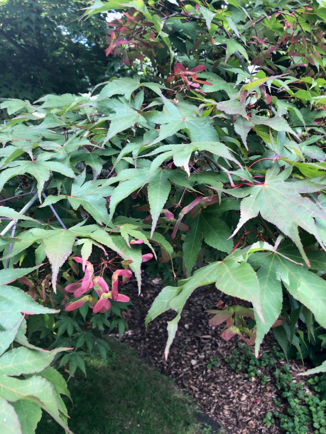 Fully open in May, the leaves have lost their original red blush, though the seeds retain it.