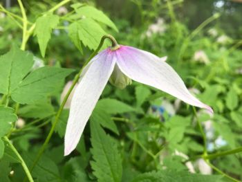 Most of our garden clematis (of which there are about three hundred species and heavens knows how many thousands of hybrids) originated in China and Japan. As well as the familiar climbing shrubs, both deciduous and evergreen, there are also herbaceous perennial species which lack the ability to cling but sprawl along the ground instead. It is a member of the Ranunculaceae (buttercup) family, which also includes hellebores, anemones, and the wondrous Japanese wood poppy, Glaucidium palmatum, the only plant in its genus – as far as is known, at any rate.
