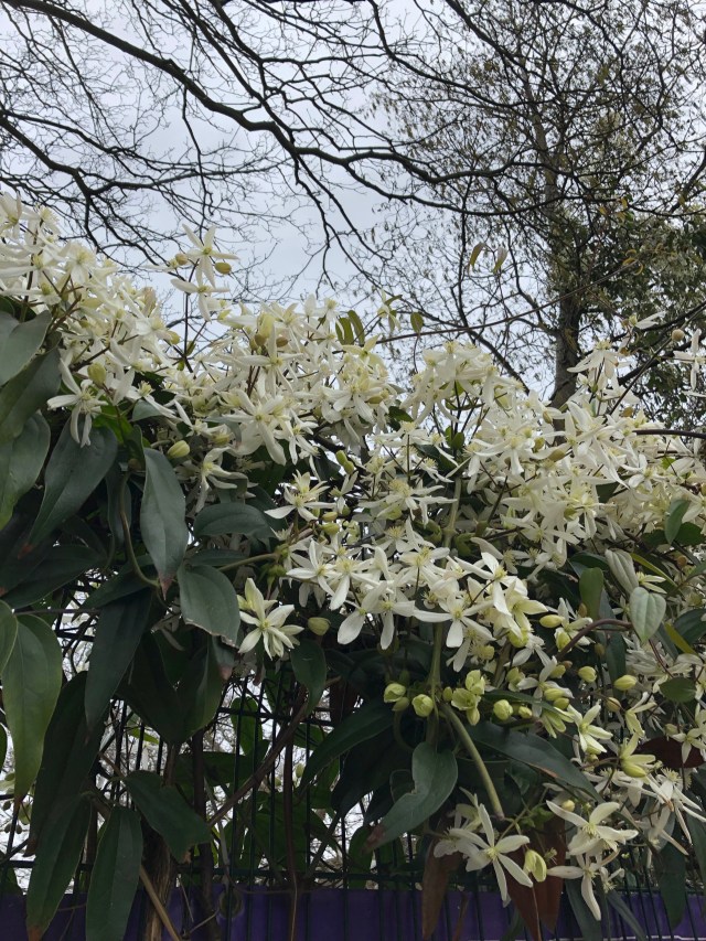 C. armandii, not from my garden, when the flowers are only beginning to open, but taken a couiple of weeks ago at the Stepney City Farm, where it clothes the hedges and always flowers early in the London microclimate.