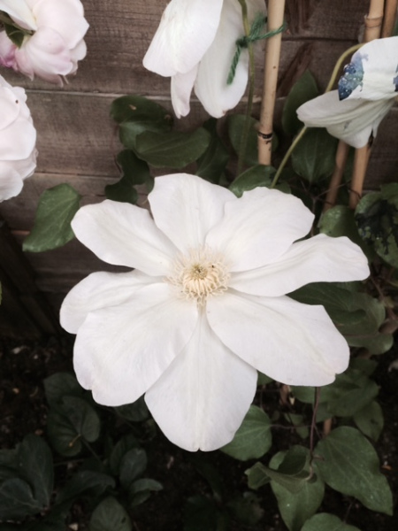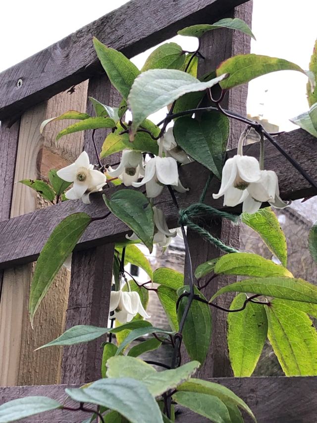 and C. viticella ‘Alba Luxurians’, with strange, partly green petals (intentionally, I think, though ‘green petal’ is a recognised disease of clematis???) which I bought about 3o years ago at the open-air market at Henley-in-Arden, Warwickshire, and is still going strong. (Unlike the market, alas …)
