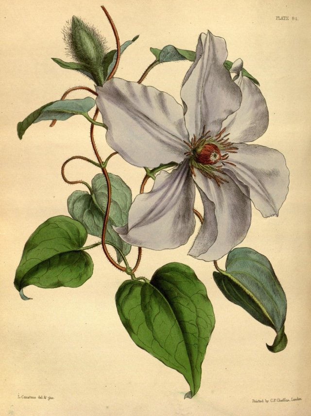 However, the consideration with clematis is not its utility but its beauty. The origin of today’s multifarious hybrids can be traced back to the travels of Robert Fortune, plant hunter and adventurer extraordinaire, who was apparently the first to bring live plants of C. lanuginosa (= down-covered, referring to the stems and sepals) back from China. (It was named by Lindley and Paxton, and depicted in vol. 3 of Paxton’s Flower Garden (1852),