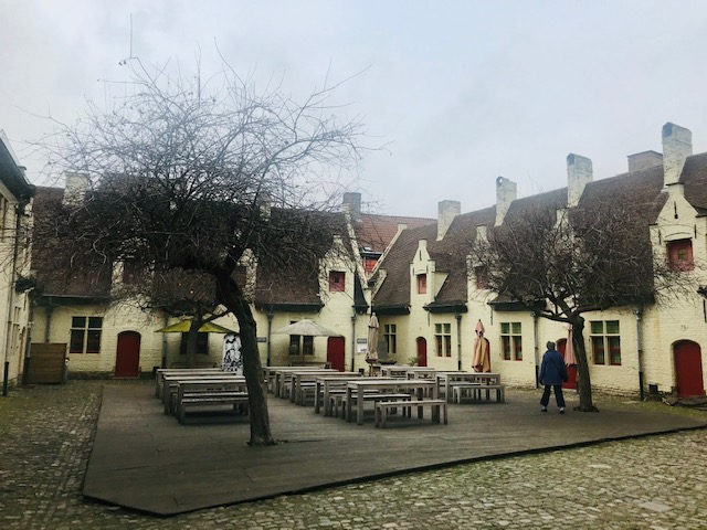 There was a nice little almshouse/hospital, the only one surviving in Ghent, and we went into the old butcher’s market hall, now a restaurant and delicatessen, where I had a very large piece of cinnamon cheesecake (an Aalst speciality, it seems).