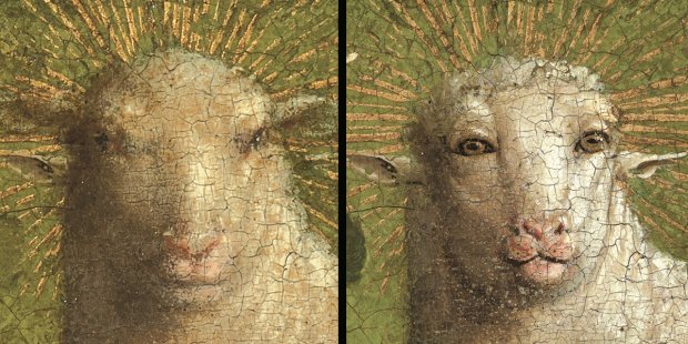 The long-term project of conservation of the altarpiece (usefully explained in a small display outside the chapel in St Bavo’s cathedral in which it is currently kept: the building of a new visitor to centre due to open in October has led to the discovery of a large ossuary against the cathedral wall) led not only to a startling new (old) brightness and clarity in the colours, but to some remarkable changes of feeling or emphasis, of which the most notable is the expression on the face of the Lamb; a former passive resignation has been replaced by a challenging gaze out at the viewer.