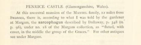 However, just to demonstrate yet again that everything is connected to everything else, Penrice Castle actually gets a mention in Adolf Michaelis’s 1882 Ancient Marbles in Great Britain (see below). Was the gardener who gave Michaelis this information Richard Milner himself?
