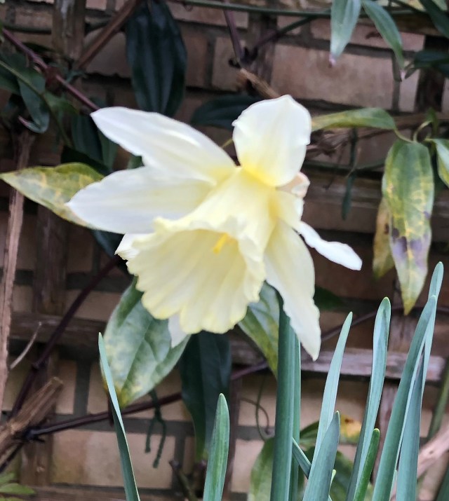He (I am assuming that the eponym is a man) has not disappointed, with delightful pale lemony flowers and the nodding habit of the native N. pseudonarcissus. Avon Bulbs’s website describes it rather well: ‘Narcissus W.P. Milner has flowers that are pale straw at first, but quickly change to milky white, with swept-forward petals, beyond which peeps the shy trumpet.’