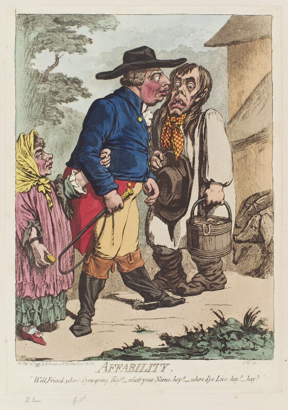 In James Gillray’s caricature ‘Affability’ of 1795, King George and Queen Charlotte are terrifying a local villager near Windsor. (Credit: the National Portrait Gallery)