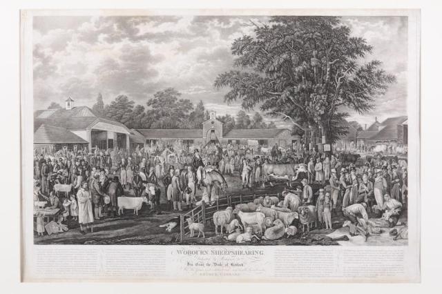 George Garrard’s 1813 engraving of the Woburn Sheepshearing gives an idea of the scale of these events. Among the luminaries at lower right are Sir Joseph Banks, wearing his Garter sash, and Arthur Young.