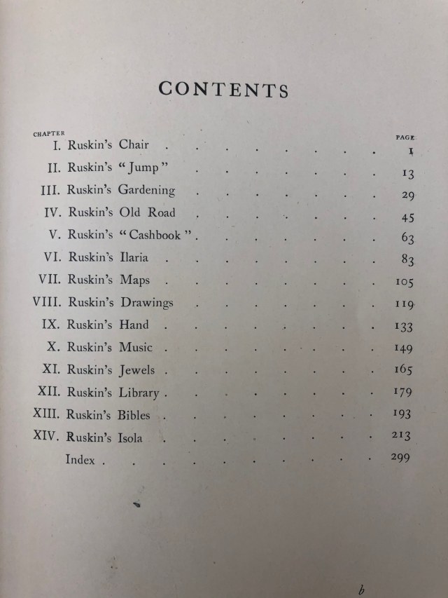 I enjoyed ‘Ruskin’s Gardening’, which (unsurprisingly) describes him as an artist of landscape, tweaking Nature here and there for aesthetic effect, rather than a bedder-out of pelargoniums (which, I think he wrote somewhere, are simply too red).