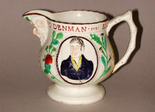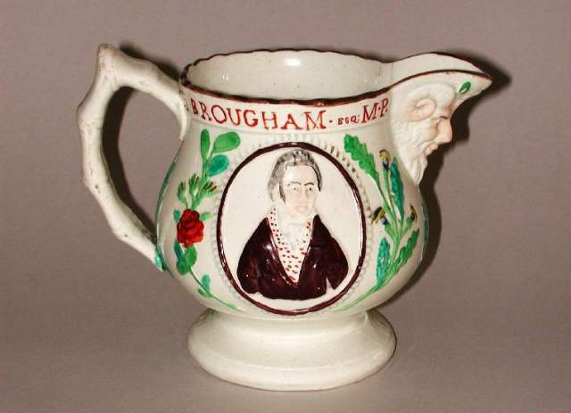 A jug with portraits of the lawyers and politicians Henry Brougham and Thomas Denham, surrounded by roses and thistles. (Credit: the Fitzwilliam Museum: C.1124-1928)